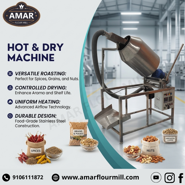 આજના સમયમાં ફૂડ પ્રોસેસિંગ ઈન્ડસ્ટ્રી ઝડપથી વિકસી રહી છે. ખાસ કરીને મસાલા, અનાજ અને નટ્સના વ્યવસાયમાં ગુણવત્તા અને સ્પીડ બંને ખૂબ જ મહત્વપૂર્ણ છે. આવી સ્થિતિમાં Hot & Dry Machine તમારા બિઝનેસ માટે એક સ્માર્ટ અને આધુનિક સોલ્યુશન સાબિત થાય છે. આ મશીન ખાસ કરીને રોસ્ટિંગ અને ડ્રાયિંગ પ્રોસેસને વધુ અસરકારક બનાવે છે. તેની મદદથી મસાલા, દાણા અને નટ્સને યોગ્ય રીતે સુકવી શકાય છે, જેથી તેની સુગંધ (Aroma) અને ગુણવત્તા લાંબા સમય સુધી જળવાઈ રહે છે. જો તમે તમારા પ્રોડક્ટની ગુણવત્તા સુધારવા માંગો છો અને ગ્રાહકોનો વિશ્વાસ જીતવા માંગો છો, તો Hot & Dry Machine એક પરફેક્ટ ઈન્વેસ્ટમેન્ટ છે. આ મશીન તમને વધુ પ્રોડક્શન, વધુ નફો અને વધુ સંતોષ આપે છે. 👉 “દરેક દાણામાં ગુણવત્તા, તમારા વિકાસની શરૂઆત” #HotDryMachine #FoodProcessing #SpiceProcessing #GrainDrying #NutProcessing #IndustrialMachine #SmallBusinessIndia #MakeInIndia #BusinessGrowth #StartupIndia #AmarFlourMill #ManufacturingIndia #HighEfficiency #FoodIndustry #GujaratiBusiness #EntrepreneurLife