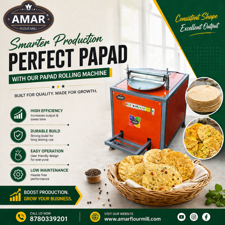 अपने बिज़नेस को दें एक स्मार्ट अपग्रेड 💼 हमारी Papad Rolling Machine के साथ पाएं: ✅ हर बार एक जैसी शेप और बेहतरीन क्वालिटी ✅ तेज़ उत्पादन – ज्यादा मुनाफा ✅ मजबूत और टिकाऊ मशीन ✅ आसान ऑपरेशन और कम मेंटेनेंस 👉 छोटे से बड़े बिज़नेस के लिए परफेक्ट सॉल्यूशन! 📞 कॉल करें: 8780339201 🌐 www.amarflourmill.com #PerfectPapad #PapadMachine #SmallBusinessIndia #MakeInIndia #FoodBusiness #StartupIndia #BusinessGrowth #EntrepreneurIndia #ManufacturingIndia #Automation #VocalForLocal #AmarIndustries #ProductionBoost