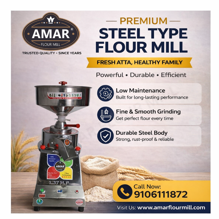 Contact No :- +91 9106111872 आज के समय में हेल्दी लाइफस्टाइल अपनाना हर किसी की प्राथमिकता बन गया है, और इसकी शुरुआत होती है हमारे रोज़ के खाने से। ऐसे में शुद्ध और ताज़ा आटा पाने के लिए एक भरोसेमंद समाधान है Premium Steel Type Flour Mill। यह फ्लोर मिल खासतौर पर उन लोगों के लिए डिज़ाइन की गई है जो क्वालिटी, टिकाऊपन और बेहतर परफॉर्मेंस चाहते हैं। इसका मजबूत स्टील बॉडी इसे न केवल आकर्षक बनाता है बल्कि लंबे समय तक बिना जंग लगे इस्तेमाल करने योग्य भी बनाता है। इस मशीन की सबसे बड़ी खासियत है इसका Fine & Smooth Grinding System, जिससे हर बार आपको मिलता है एकदम मुलायम और पौष्टिक आटा। साथ ही इसका Low Maintenance डिज़ाइन आपको बार-बार सर्विस की झंझट से बचाता है। यह फ्लोर मिल घर के उपयोग के साथ-साथ छोटे बिज़नेस के लिए भी एक बेहतरीन विकल्प है। इसकी पावरफुल और एफिशिएंट परफॉर्मेंस आपको कम समय में ज्यादा उत्पादन करने में मदद करती है। अगर आप अपने परिवार के लिए हेल्दी और शुद्ध आटा चाहते हैं, या फिर एक छोटा सा बिज़नेस शुरू करने की सोच रहे हैं, तो यह मशीन आपके लिए एक स्मार्ट और भरोसेमंद इन्वेस्टमेंट है। 👉 आज ही अपने किचन या बिज़नेस को दें एक नया अपग्रेड! #FlourMill #SteelFlourMill #HealthyAtta #FreshAtta #HealthyFamily #GharKaKhanna #MakeInIndia #SmallBusinessIndia #StartupIndia #AttaChakki #FoodBusiness #IndianKitchen #QualityMatters #DurableMachine #LowMaintenance #SmartInvestment #VocalForLocal #AmarIndustries #PowerfulPerformance #DailyNeeds