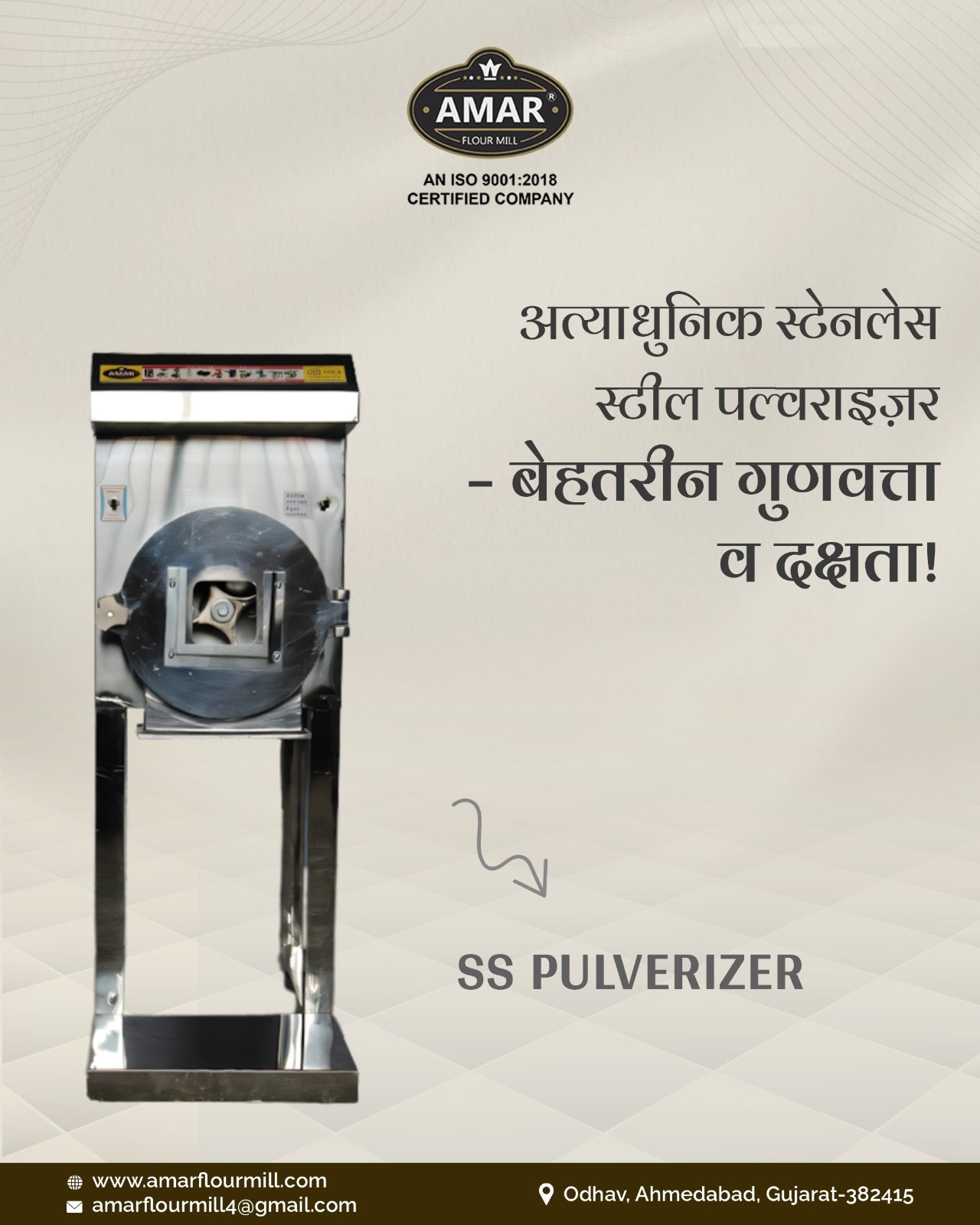 Amar Industries, based in Ahmedabad, Gujarat, manufactures a 2 HP Automatic Stainless Steel (SS) Pulverizer suitable for both domestic and small-scale commercial applications. Key Specifications: Motor Power: 2 Horsepower (HP) Grinding Capacity: Approximately 15 to 25 kilograms per hour Material Construction: High-quality Stainless Steel for durability and easy maintenance Operation Mode: Automatic Electricity Connection: Single Phase Dimensions: 27" x 17" x 44" Weight: Approximately 80 kilograms Features: Efficient Grinding: Designed to grind various materials, including grains like wheat, rice, maize, millet, besan, ragi, juwar, dal, small-sized black pepper, sugar, and spices such as red chili, turmeric, and dry leaves. User-Friendly Operation: Simplifies the grinding process, making it accessible for both domestic and commercial users. Low Power Consumption: Consumes approximately 1.5 units per hour, ensuring energy efficiency. Safety Features: Equipped with necessary safety mechanisms to ensure safe operation.